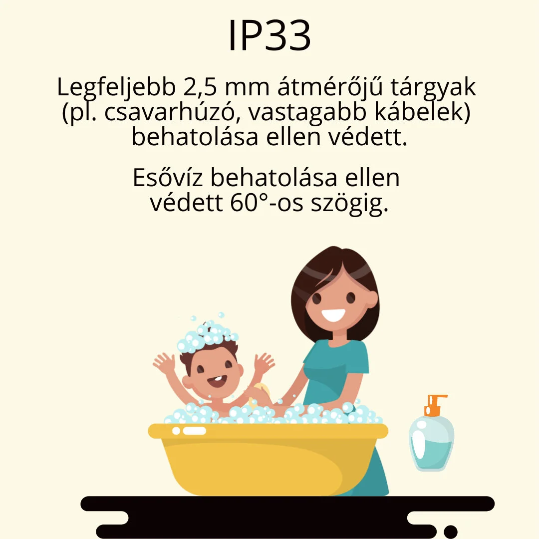 A berendezés IP 33 érintésvédelmi besorolással rendelkezik, így nedves helyiségekben, például fürdőszobában is használható.
